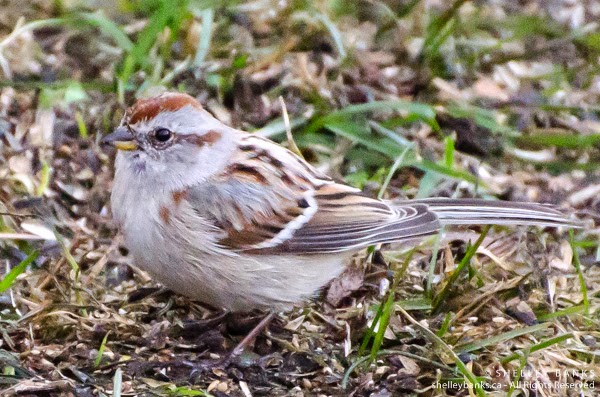 American Tree Sparrow that flew through at dusk a few weeks ago. It checked out the scattered bird seed on the grass in our Regina, SK, backyard in the late light of the day, but by morning, our early visitor — notable for its bright rusty crown and eye streak — was gone.