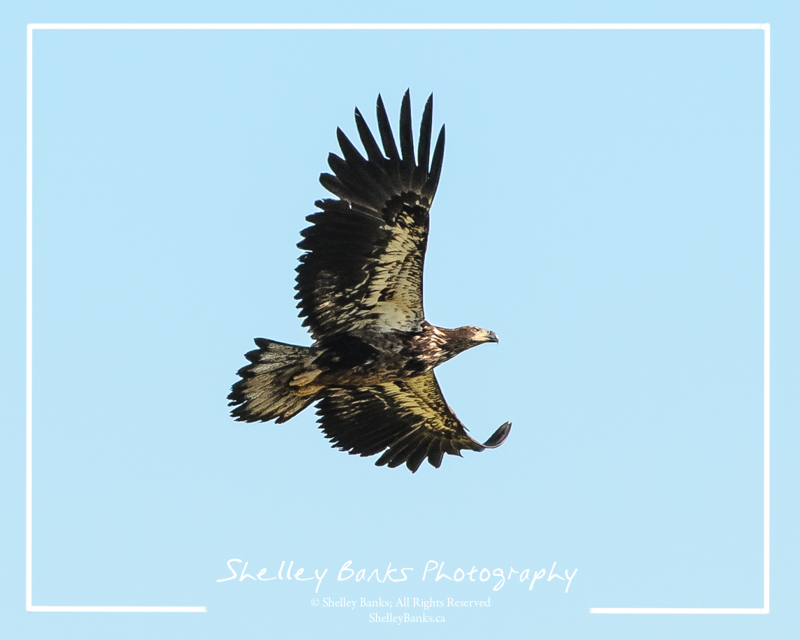 | Juvenile Bald Eagle in flight, in Richmond, B.C. (This is the same young bird as in the shot below.) © SB |